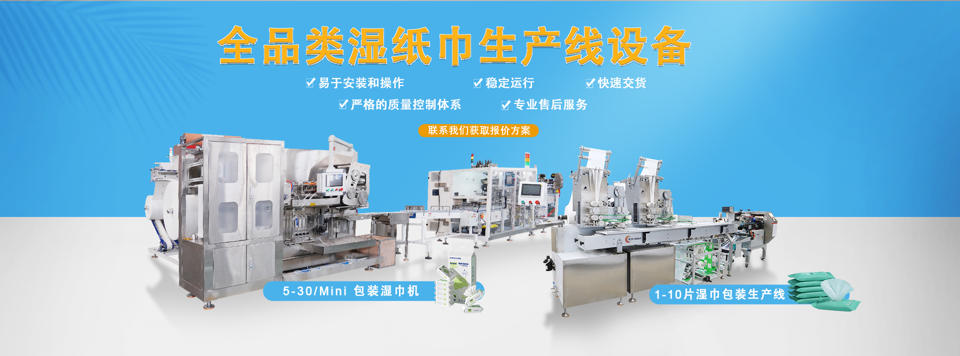 公司產品有單片四邊封濕巾機、1-10片裝背封濕巾機、5-30片裝背封濕巾機、6道全自動濕巾機、6道半自動濕巾機、12道全自動濕巾機、16道全自動濕巾機、20道全自動濕巾機、52道全自動濕巾機等。